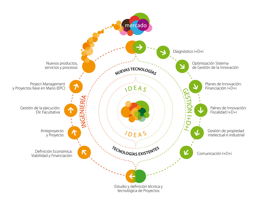 Proporcionamos a nuestros clientes asistencia y apoyo en toda la Cadena de la innovación, pudiendo actuar en cualquier fase o eslabón de la misma.