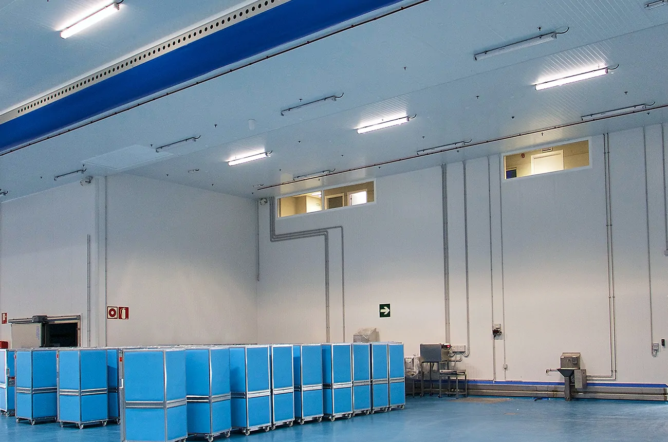 La plataforma contempla un área para la recepción y descarga de mercancía y materia prima, centro de manipulación, almacenamiento y preparación de pedidos de carnes, pescados, frutas, hortalizas, productos congelados, etc. También cuenta con cámaras de fresco refrigerado, áreas de manipulación y preparación, almacenes de seco de diferentes productos, áreas específicas de preparación de pedidos y expediciones, logística inversa, lavado de contenedores. Hemos diseñado espacios para oficinas y salas técnicas de instalaciones.